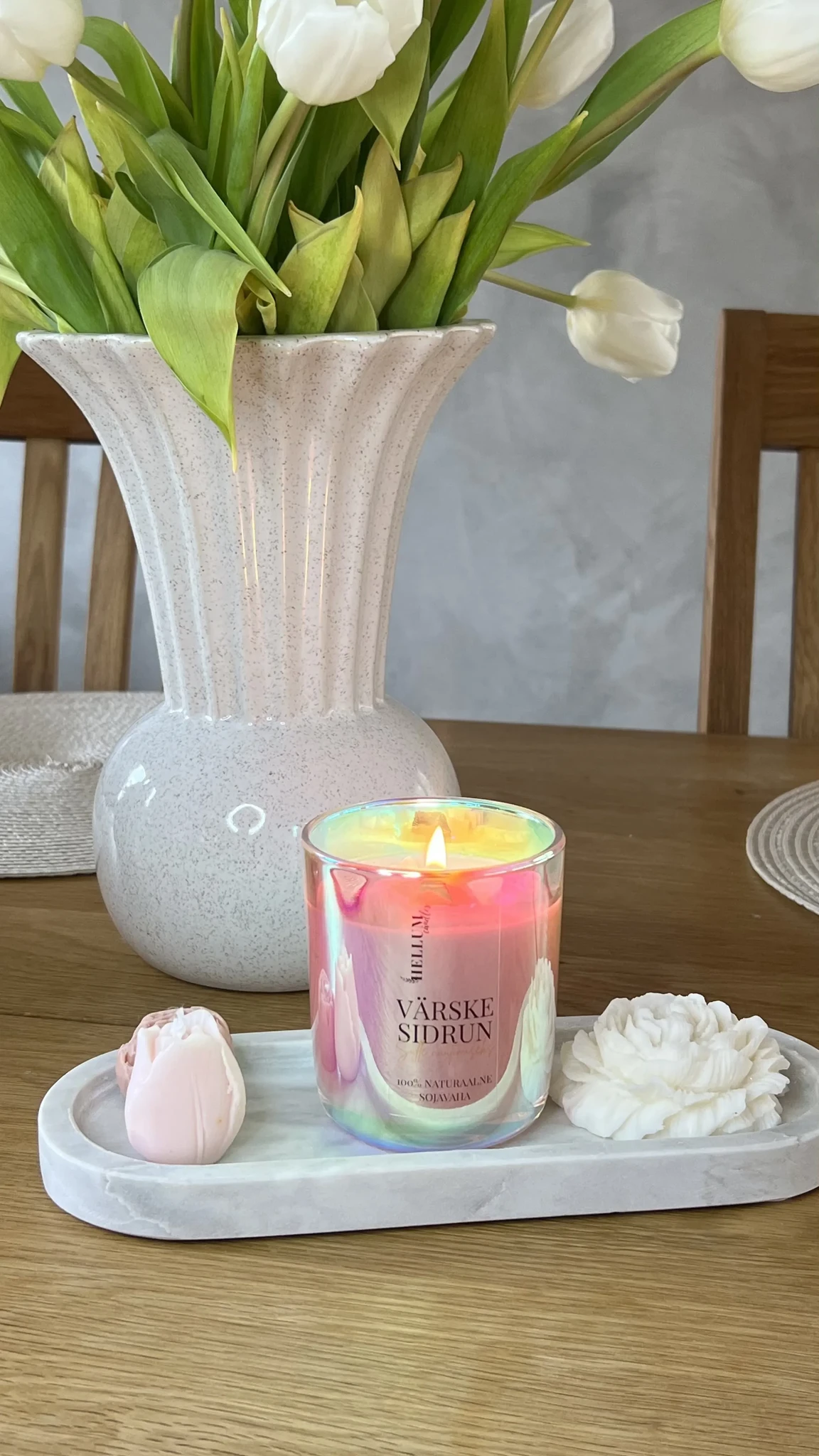 Eriliseks teeb selle küünla pärlmutter-vikerkaare klaas, mis on tõeline pilgupüüdja. Klaas käitub nagu kameeleon – erinevas valguses muutub selle toon ja küünla põledes kumab valgus läbi klaasi pehme vikerkaare helgina. Küünalt kaunistavad õrnad kevadised lilleõied.