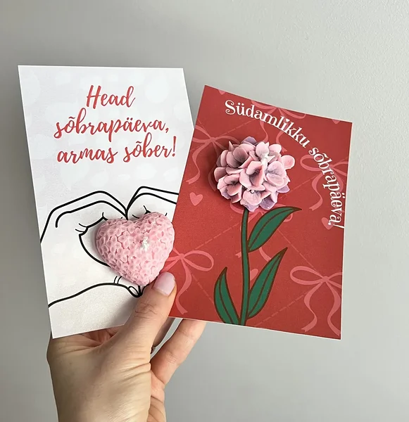 Iga kaart valmib vastavalt Sinu soovile A5 või A6 formaadis kaunile paberile. Kaardi küljes on käsitsi sojavahast valatud käsitööküünal, mis on lõhnastatud IFRA standarditele vastava aroomiga. Küünal annab edasi veel soojema tunde.